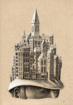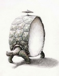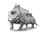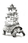 2012tekening van een landschildpad met een Dzong, of boeddhstische tempel op zijn rug.
