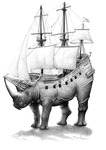 2012neushoorn met een voc schip op zijn rug. indische neushoorn als verwijzing naar de verenigde oostindische compagnie.
